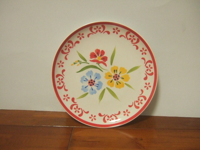 【タイ製】平皿23cm 3色の花柄 周りは赤の模様 陶磁器 ランパーン 電子レンジ可