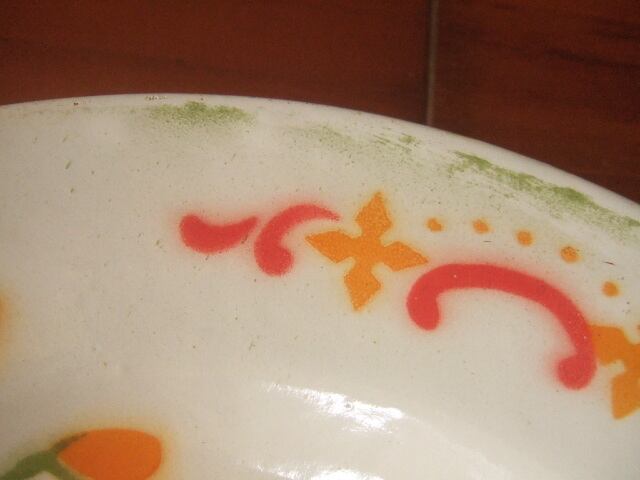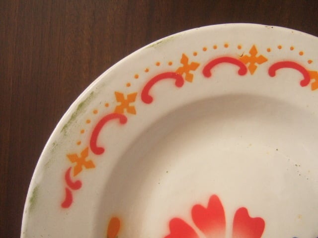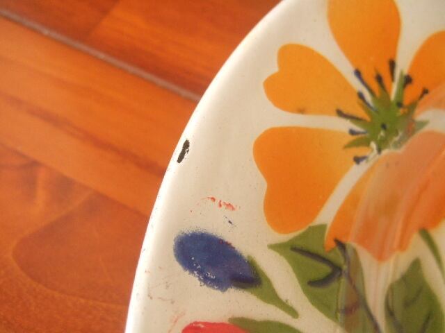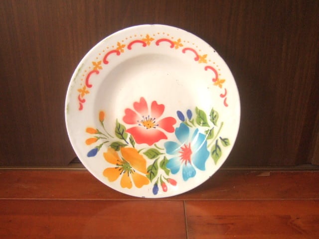 【タイ製】レトロ柄のホーロー皿 上部に赤黄色の模様 青赤黄色の花柄 ハイビスカス 23cm径