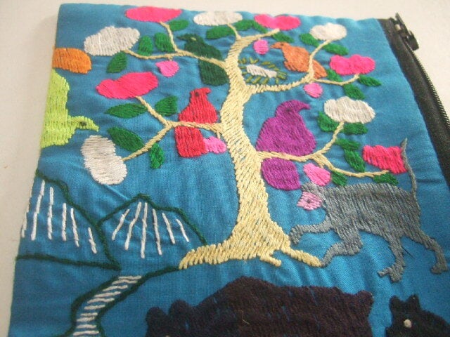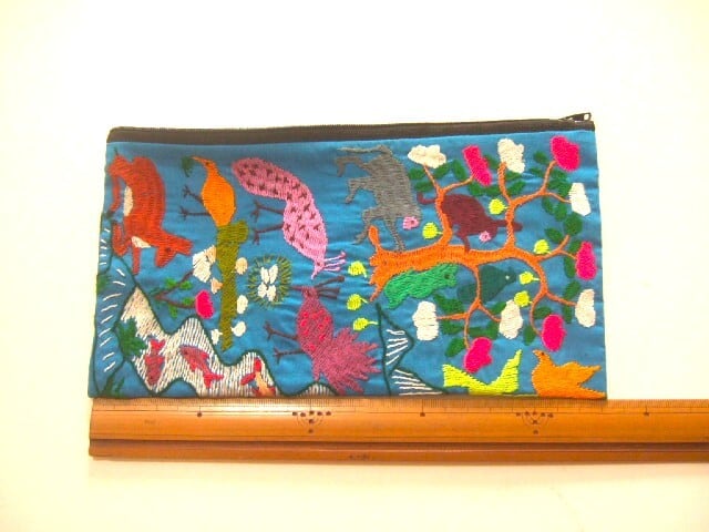 【ラオス製】 民族風の刺繍したポーチ 動物柄パターン 青色地 23x12cm 【レターパック可】