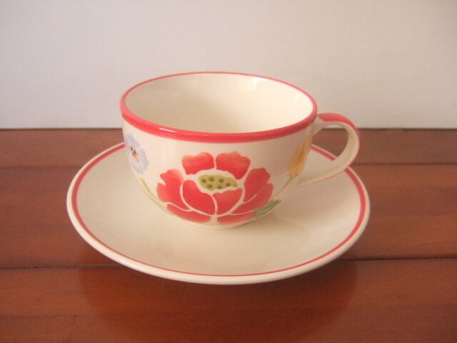 【タイ製】花柄のカップ&ソーサー カップ9cm径 ソーサー15cm径 赤の色合い 陶磁器 電子レンジ可