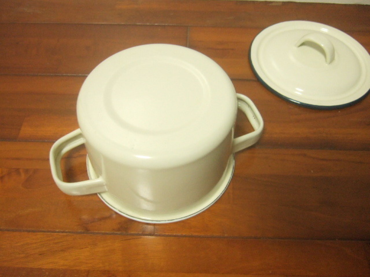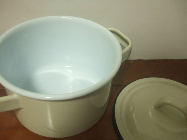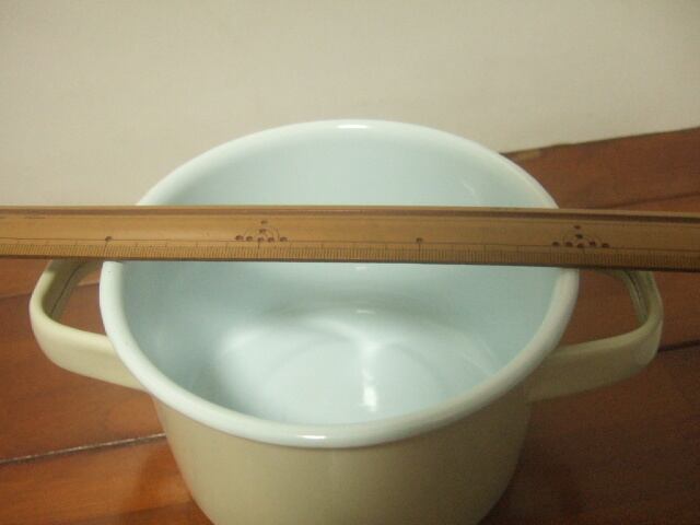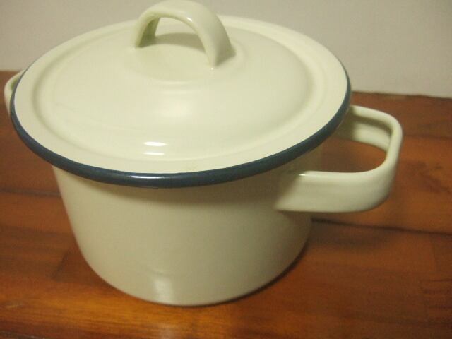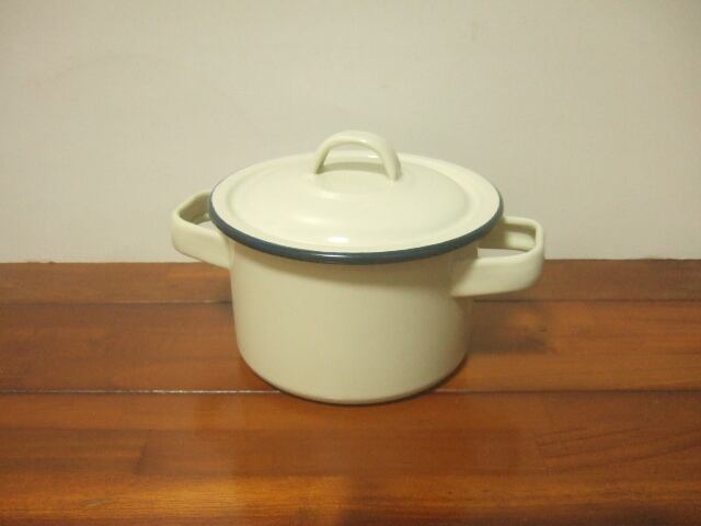【タイ製】ホーロー両手鍋 ふた付 15cm クリーム色 小ぶりなお鍋 フタに傷有