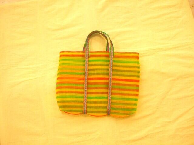 台湾製 便利なメッシュのトートバッグ 網素材 黄緑黄色オレンジのボーダー 3号サイズ 【レターパック可】